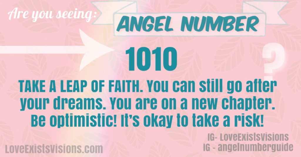 Are you seeing angel number 1010? It’s time for a new chapter! Your doubts are the only things holding you back from the new beginning. You don’t need to have all the answers to take a leap of faith.